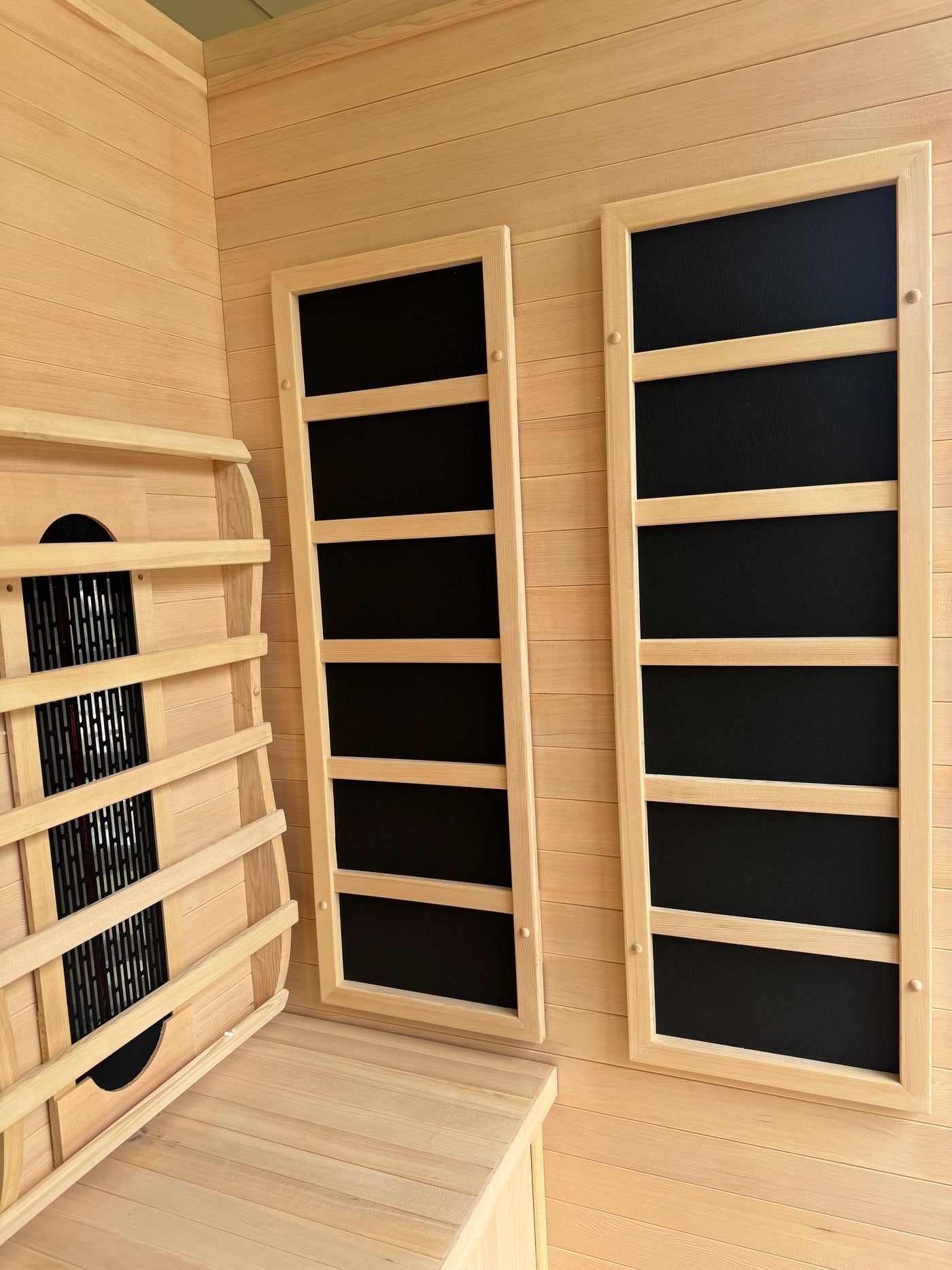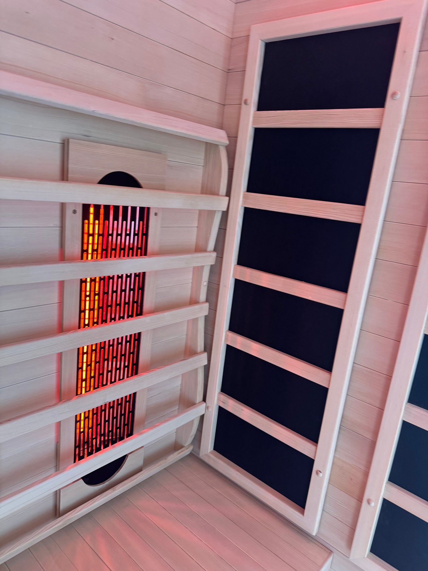 Unlike a traditional sauna, infrared saunas don’t heat the air around you. Instead, they use infrared lamps (that use electromagnetic radiation) to warm your body directly.